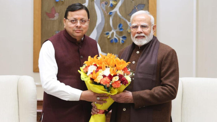 पीएम मोदी से भेंट करते सीएम पुष्कर सिंह धामी।