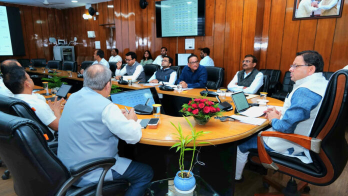मुख्यमंत्री पुष्कर सिंह धामी अधिकारियों की बैठक लेते हुए।