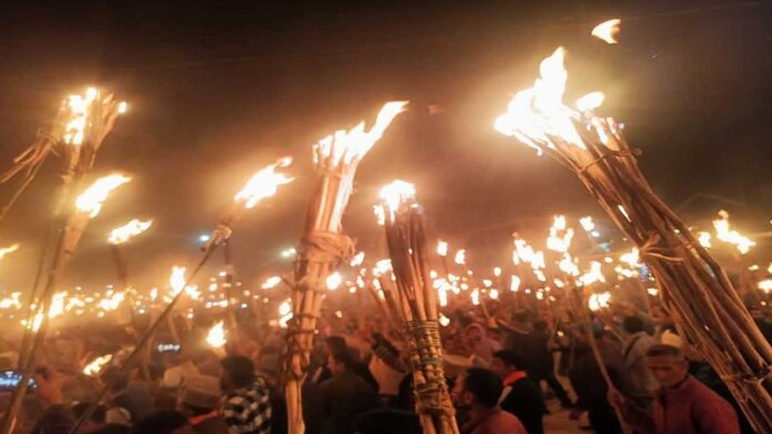 विकासनगर। जौनसार बावर के आराध्य देव छत्रधारी चालदा महासू महाराज मंदिर दसऊ में पांच दिवसीय दिवाली का आगाज हो गया है। होले (मशालें) जलाकर पांच दिवसीय दिवाली की शुरुआत हुई। इस दौरान खत पट्टी दसऊ पशगांव के करीब 15 गांवों के लोग ढोल दमऊ की थाप पर मंदिर परिसर पंहुचे।